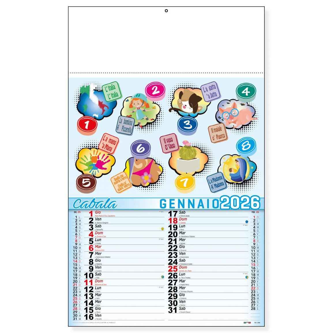 Calendario trimestrale “Cabala” con testata pressofusa, composto da 12 fogli in carta patinata lucida da 70 gr. Misura 28,8×47 cm, ideale per uffici e spazi commerciali. Include personalizzazione ad un colore della testata, perfetto per promuovere il tuo brand con stile e funzionalità.