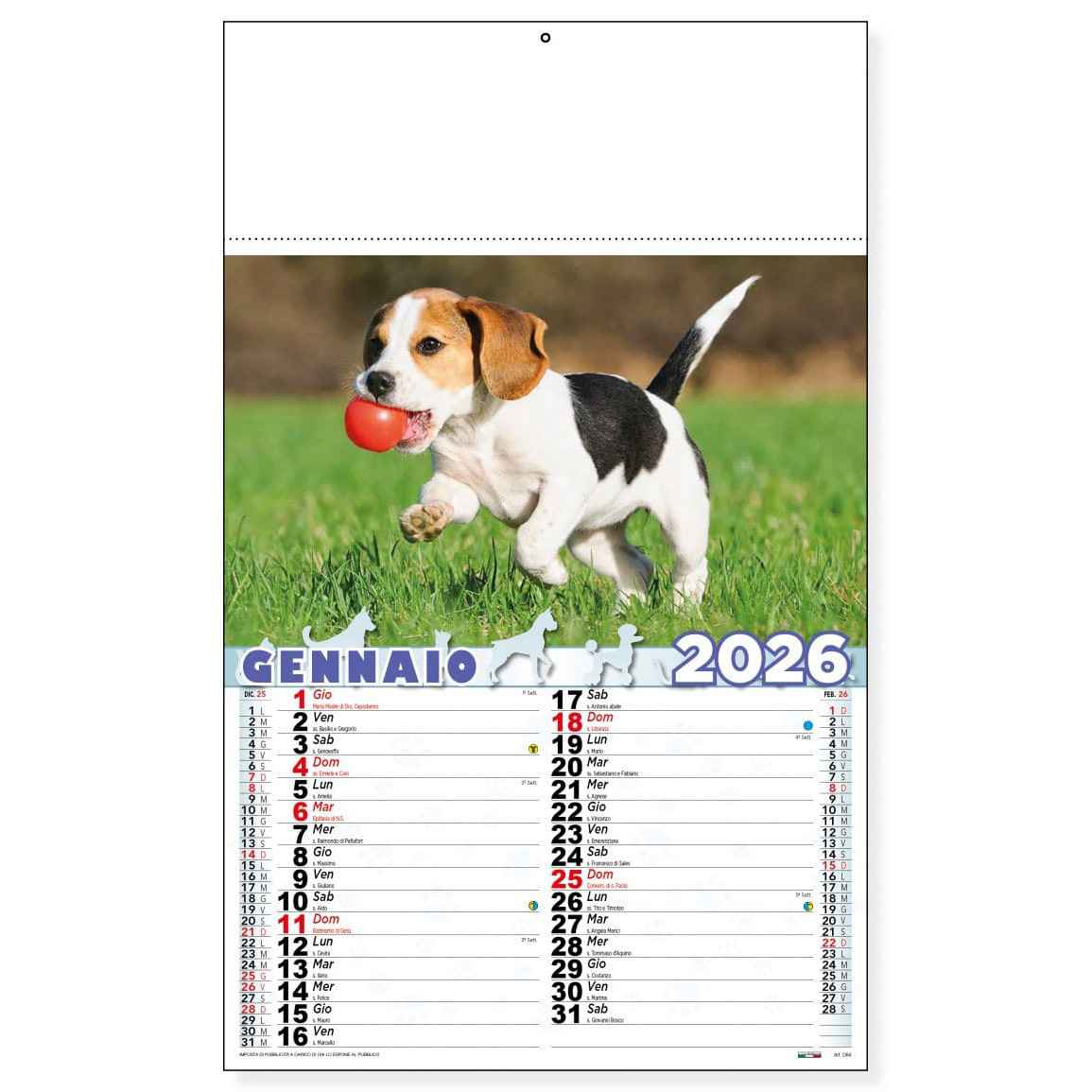 Calendario trimestrale “Cani e Gatti” con testata pressofusa, composto da 12 fogli in carta patinata lucida da 70 gr. Misura 28,8×47 cm, ideale per uffici e case. Include personalizzazione della testata ad un colore, perfetto per promuovere il tuo brand.